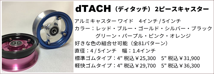 | 4インチ アルミキャスター ワイド パープル・ピンク・レッド・ブルー・ゴールド・シルバー・ブラック サイズ:4インチ 幅:1.4インチ ゴム硬度:80° キャスターのカラーは付属していません 1台分(2本)税込¥15,400 |